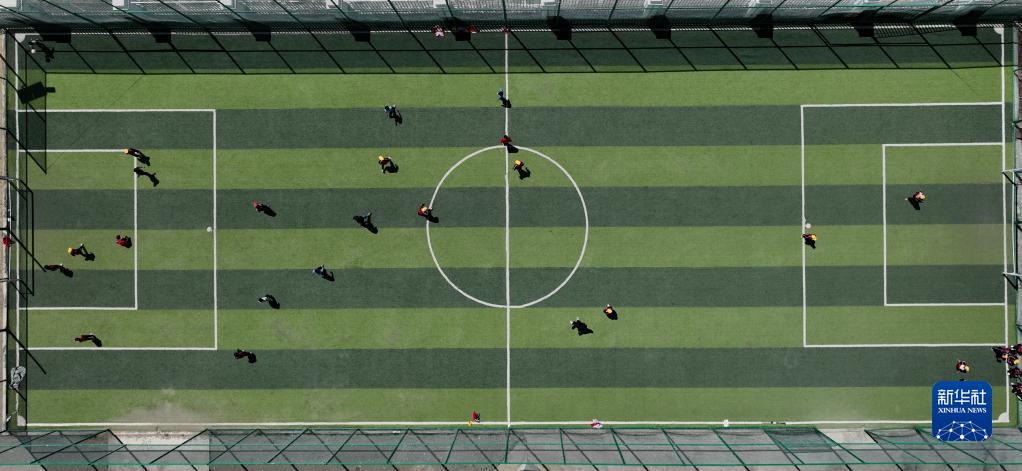 扎西宗鄉完全小學(xué)的學(xué)生在體育課上踢足球(6月5日攝,無(wú)人機照片)。新華社記者 晉美多吉 攝