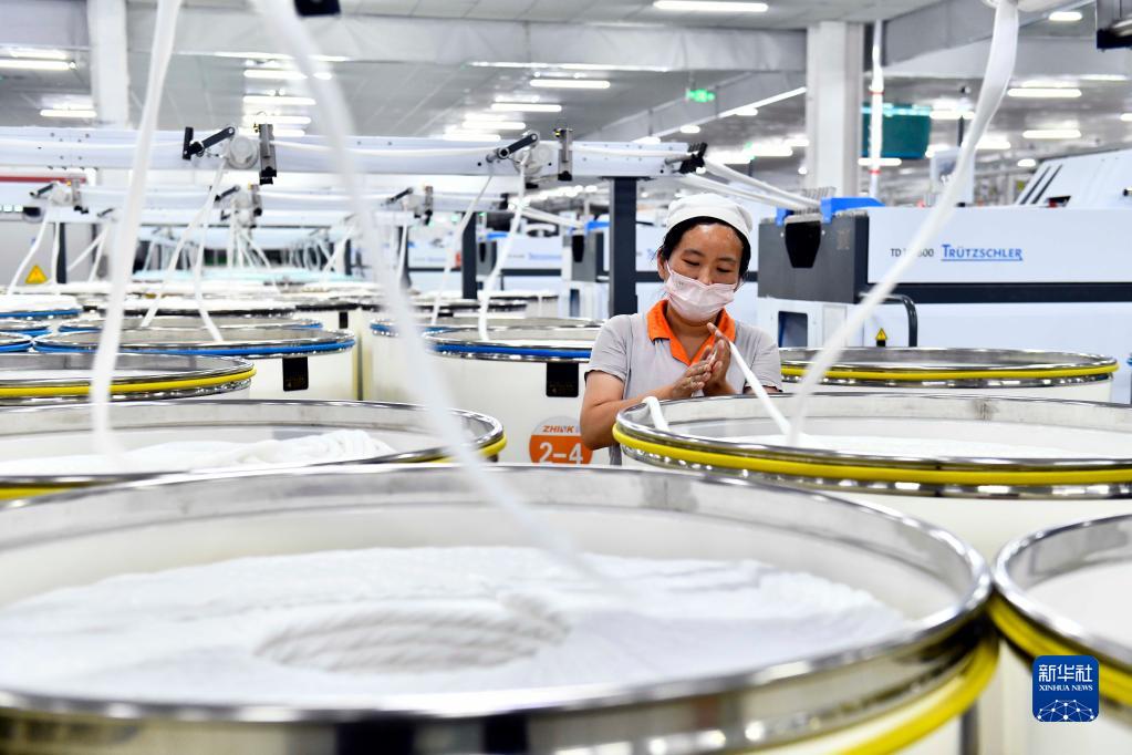 6月7日,在山東正凱新材料股份有限公司,工人在加工高端紡線(xiàn)。