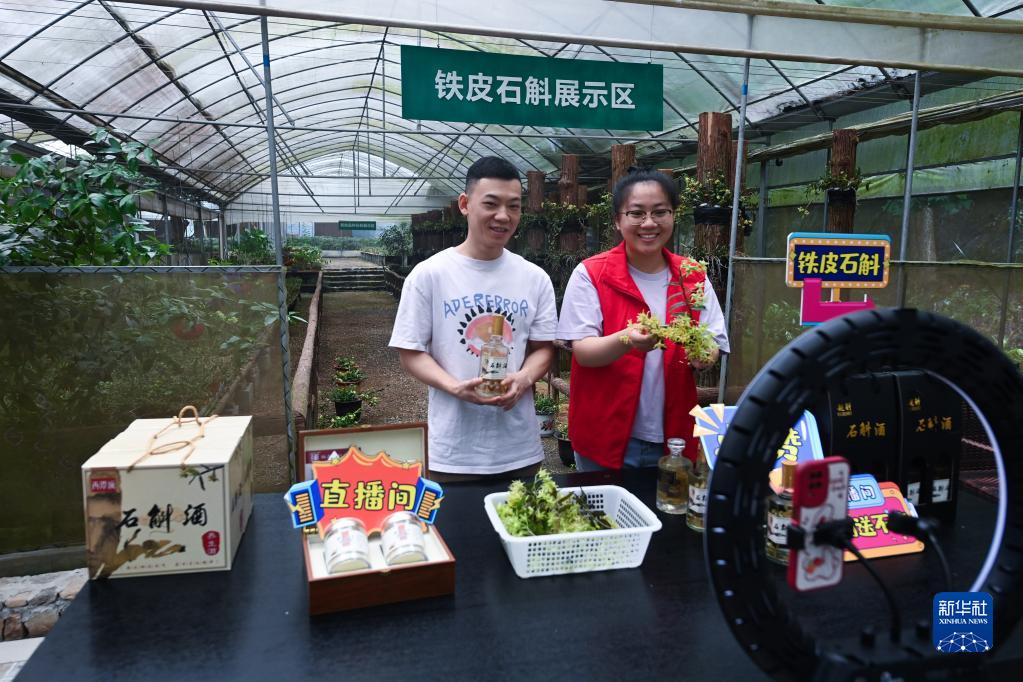 6月8日,在諸暨市東白湖鎮的鐵皮石斛有機種植基地,東白湖鎮黨員志愿者(右)和基地負責人孫思寶一起直播賣(mài)鐵皮石斛花茶、鐵皮石斛酒等產(chǎn)品。
