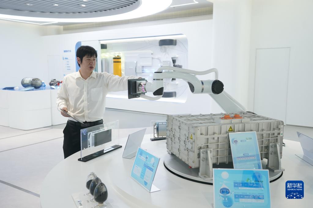 6月7日,在位于常熟的中歐氫能技術(shù)創(chuàng )新中心,工作人員在介紹氫燃料電池電堆。