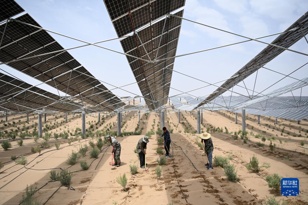 困難面前不低頭,敢把沙漠變綠洲。在八步沙“六老漢”奮斗精神鼓舞下,一代代勤勞樸實(shí)的人們奮戰在防沙治沙“接力賽”上??蒲腥藛T以沙為友,科學(xué)治沙讓沙化土地防治的可持續性顯著(zhù)增強。板上發(fā)電、板下種植、板間養殖、治沙改土的模式,使光伏產(chǎn)業(yè)與生態(tài)治理深度融合。人們從光伏治沙等沙產(chǎn)業(yè)中獲益,沙漠經(jīng)濟效益反哺荒漠化防治循環(huán)發(fā)展。