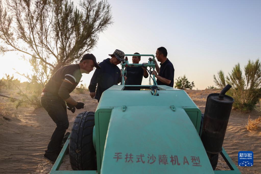 5月31日,武威市民勤縣薛百鎮的農民們使用新一代手扶式沙障機壓草方格。