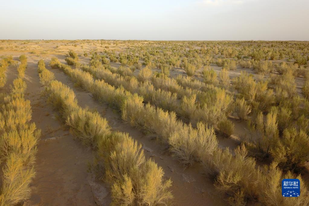 這是5月31日在武威市民勤縣薛百鎮拍攝的人工梭梭林(無(wú)人機照片)。