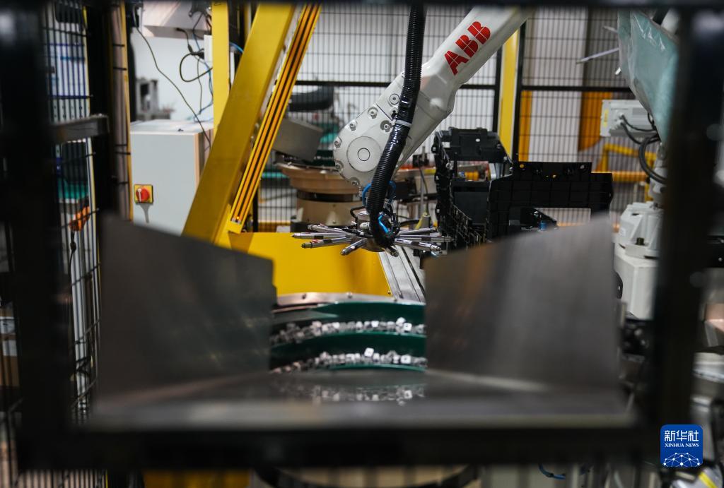 6月7日,在江蘇常熟汽飾集團生產(chǎn)車(chē)間,機械手臂在安裝卡扣。