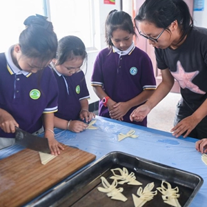 6月8日,學(xué)生們在傳統習俗課上學(xué)習做當地特色美食——麥花。