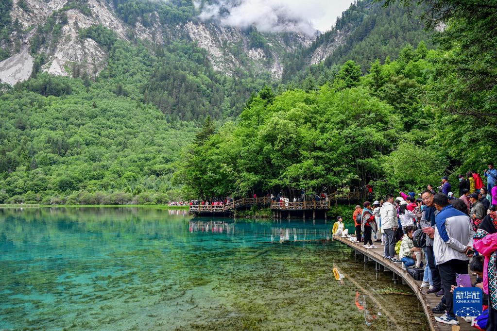 九寨溝景區五花海景點(diǎn)人流如織(6月7日攝)。
