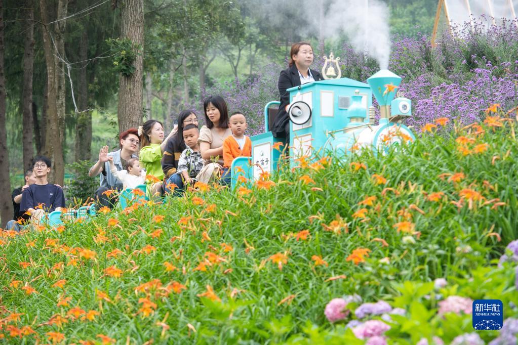 6月8日,游人在黎明古村內搭乘觀(guān)光小火車(chē)游玩。