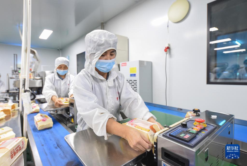 6月8日,河北邱縣一家面包生產(chǎn)企業(yè)工人在包裝車(chē)間工作。
