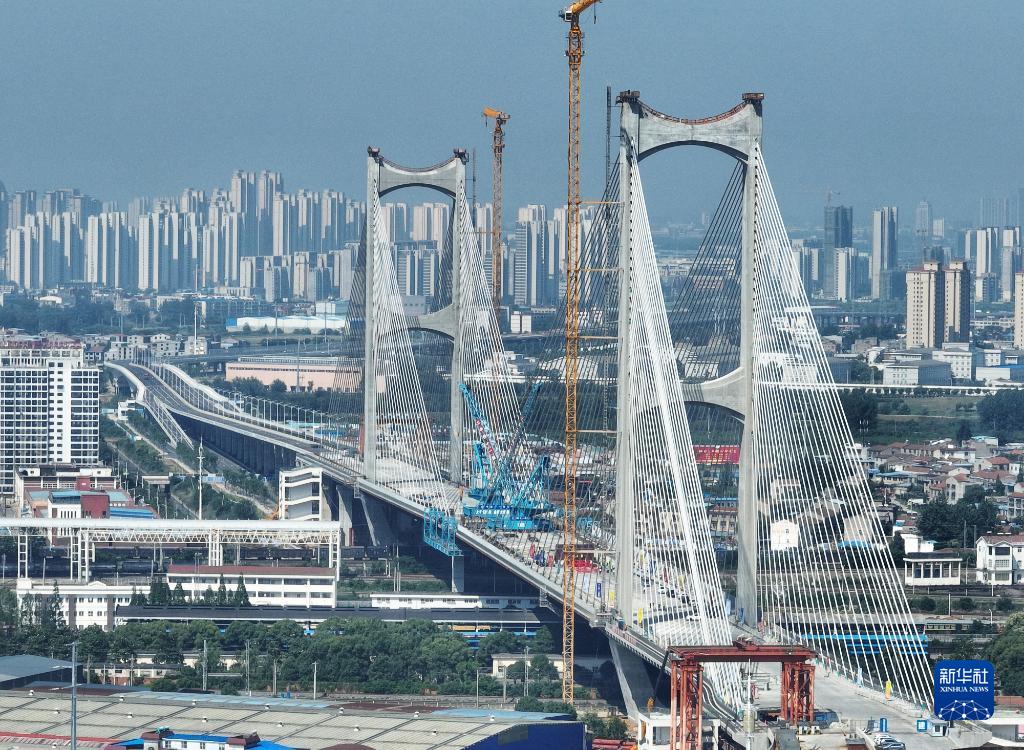 6月8日,中鐵十一局施工機械將襄陽(yáng)北編組站大橋的最后一段鋼主梁吊裝到位。