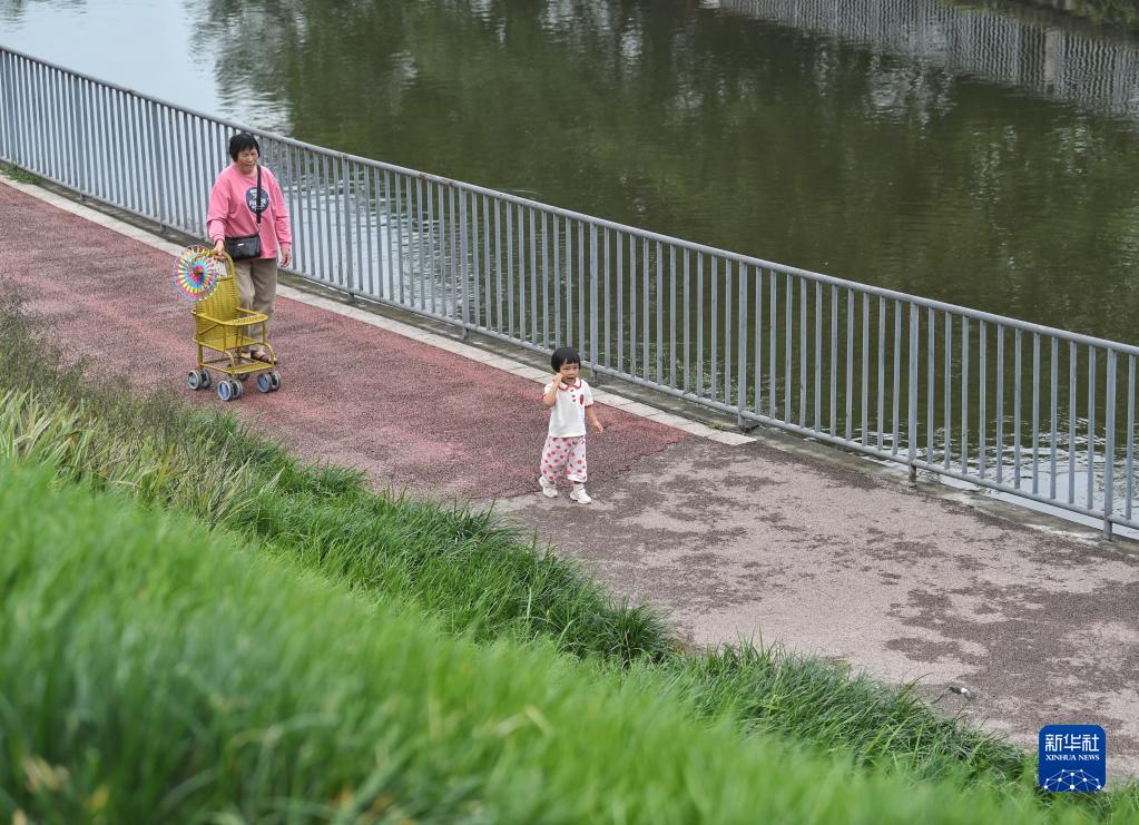6月1日,瀘州市民在玉帶河邊休閑散步。