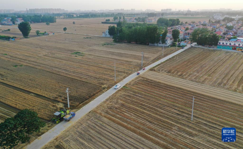 6月7日,在滑縣棗村鄉袁營(yíng)村,收割機將收獲的小麥裝車(chē)(無(wú)人機照片)。
