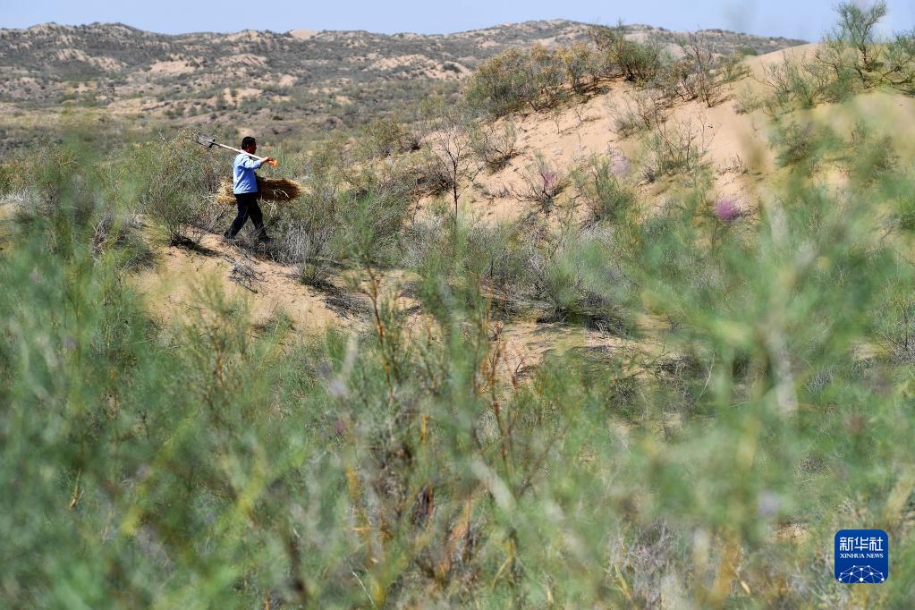工作人員在白芨灘國家級自然保護區補扎草方格(6月7日攝)。