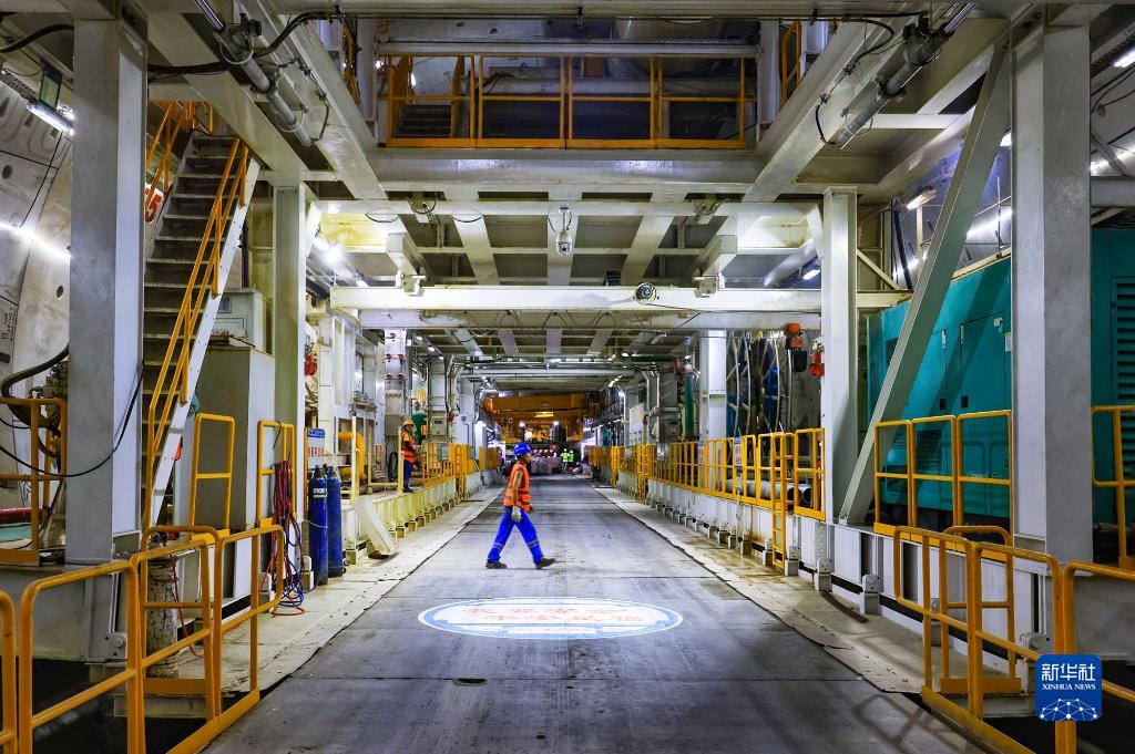 6月8日,施工人員走過(guò)深圳媽灣跨海通道“媽灣號”盾構機。