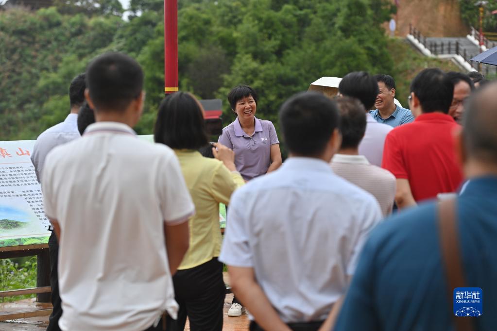 6月7日,在蒼梧縣六堡鎮山坪村,祝雪蘭向來(lái)訪(fǎng)者介紹六堡茶文化和茶產(chǎn)業(yè)發(fā)展情況。
