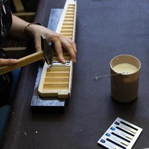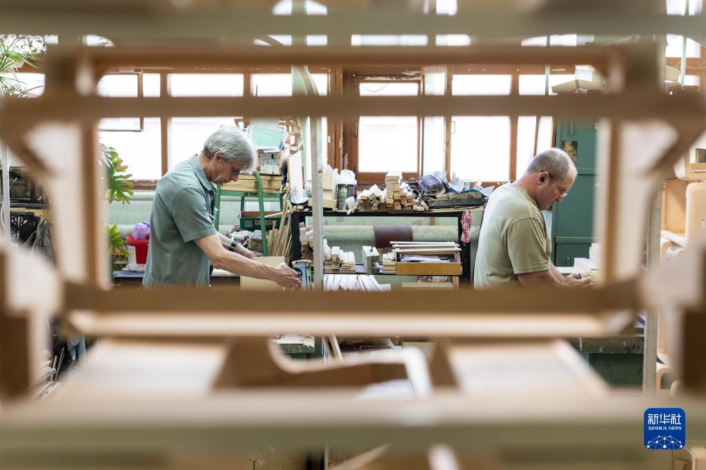 6月7日,工作人員在俄羅斯圖拉加工手風(fēng)琴琴身。
