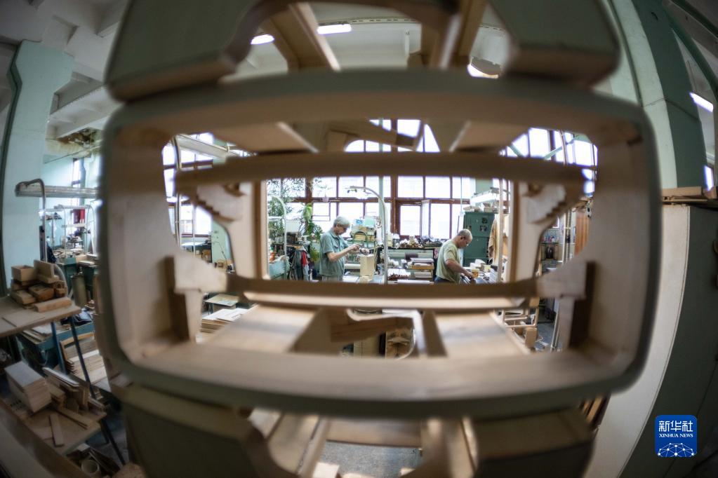 6月7日,工作人員在俄羅斯圖拉加工手風(fēng)琴琴身。