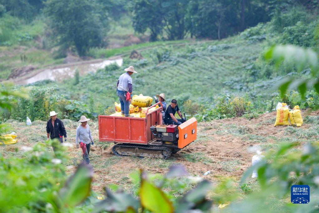 6月8日,在豐都縣虎威鎮大池社區的藠頭田,當地村民用小型農機轉運采收的藠頭。