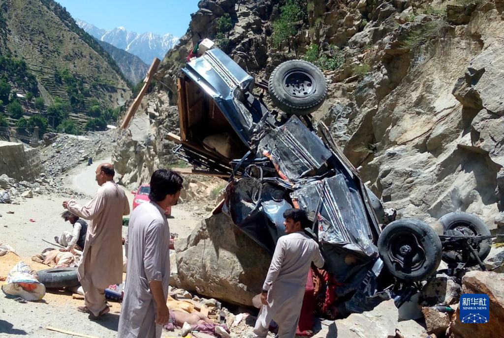 6月8日,在巴基斯坦開(kāi)伯爾-普什圖省的上迪爾地區,人們聚集在墜入峽谷的車(chē)輛周?chē)?/p>