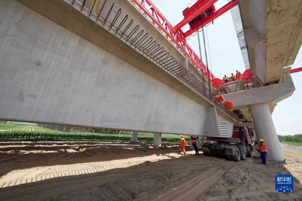 6月8日,工人在河北省昌黎縣境內的秦唐高速三標段建設工地吊裝預制梁。