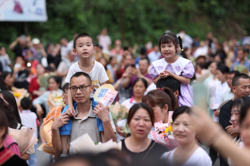 6月9日,在湖南省懷化市通道侗族自治縣第一中學(xué)考點(diǎn),家長(cháng)帶孩子等待哥哥姐姐走出校園。