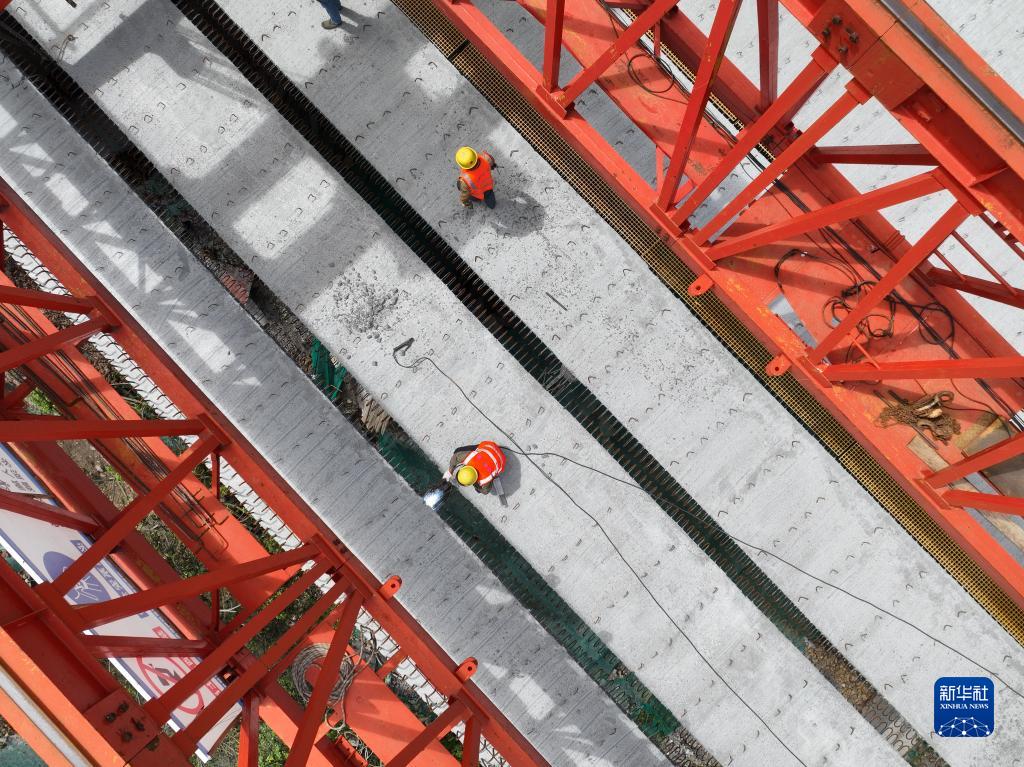 6月9日,工作人員對最后一片T形梁施工(無(wú)人機照片)。