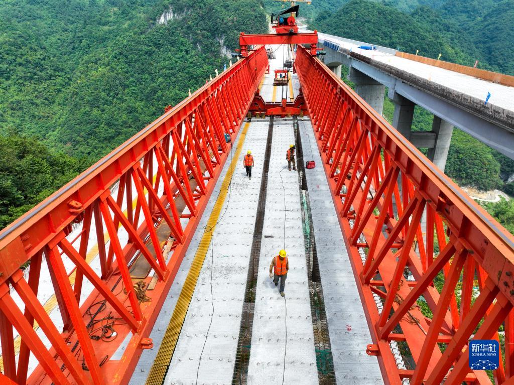 6月9日,工作人員對最后一片T形梁施工(無(wú)人機照片)。