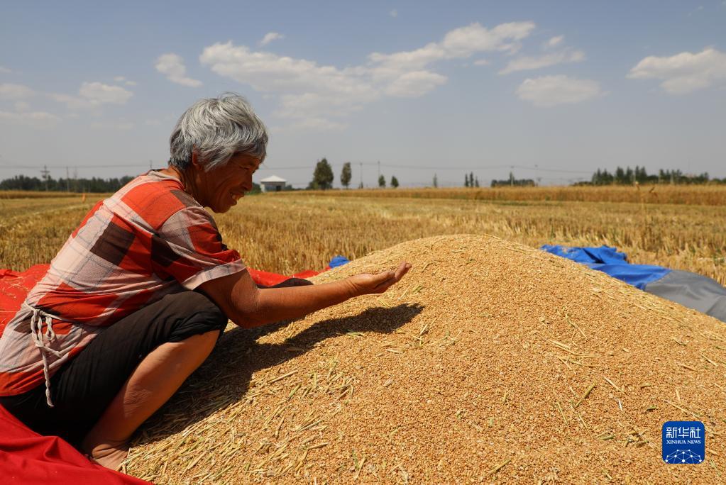 6月9日,在河北省邢臺市廣宗縣東召鄉田家屯村,農民查看剛收獲的小麥。