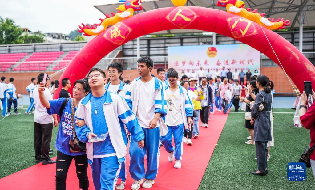 6月9日,烏當中學(xué)高三學(xué)生在畢業(yè)典禮上走過(guò)成人門(mén)。