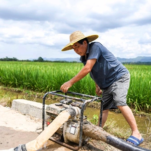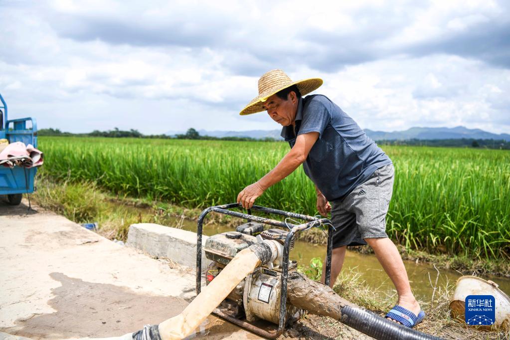 6月7日,在廣西崇左市寧明縣明江鎮峙利村,村民使用抽水設備澆灌稻田。