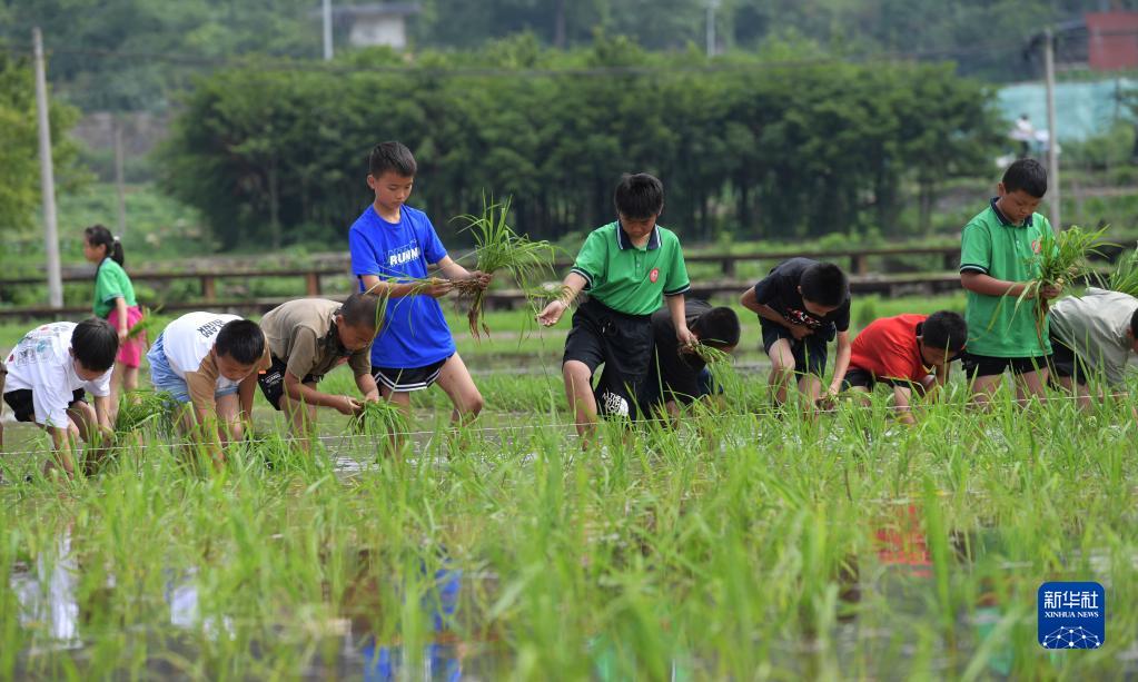 6月9日,學(xué)生在貴州省綏陽(yáng)縣中小學(xué)勞動(dòng)教育綜合實(shí)踐基地體驗插秧。