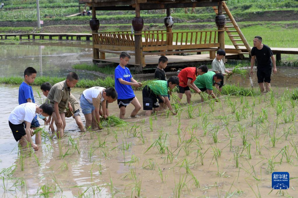 6月9日,學(xué)生在貴州省綏陽(yáng)縣中小學(xué)勞動(dòng)教育綜合實(shí)踐基地體驗插秧。
