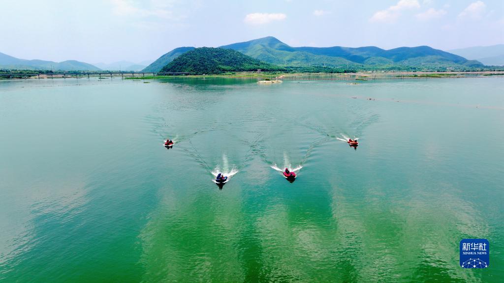 6月9日,在浙江省湖州市長(cháng)興縣合溪水庫煤山段,應急救援隊進(jìn)行沖鋒舟編隊演練(無(wú)人機照片)。