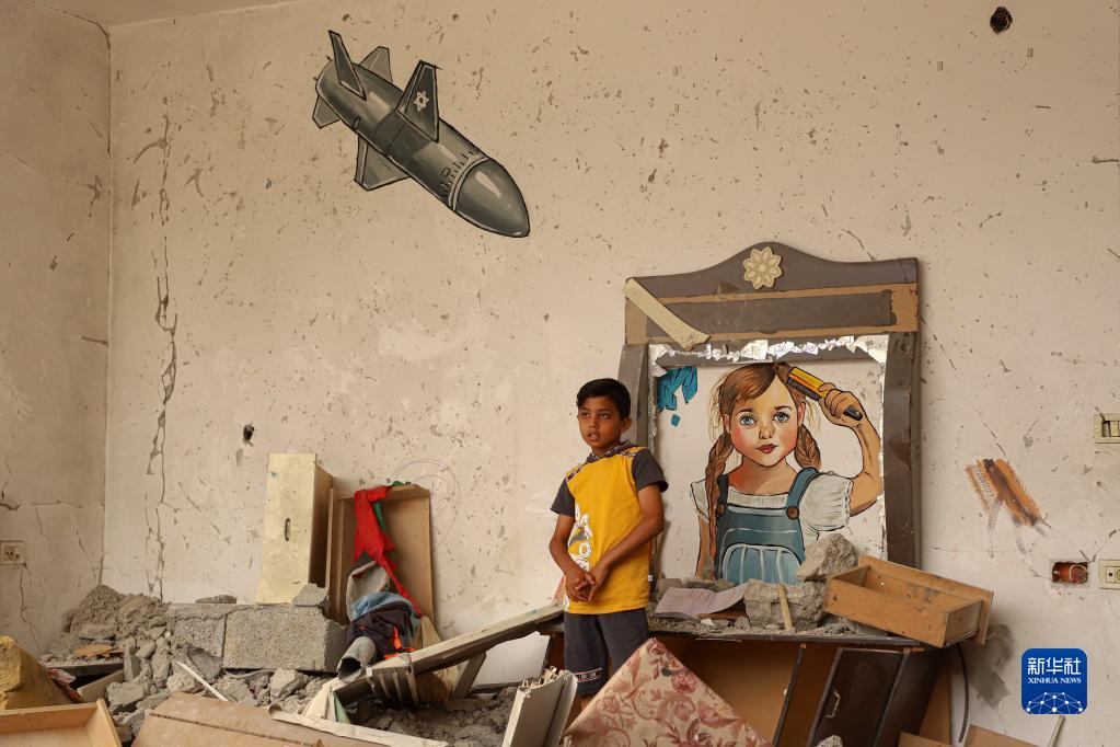 6月8日,兒童在加沙地帶中部一處難民營(yíng)附近畫(huà)有涂鴉的廢墟玩耍。