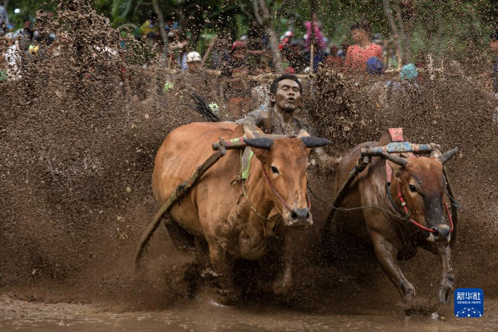 6月3日,在印度尼西亞西蘇門(mén)答臘省,一名男子在水稻田里參加傳統的奔牛比賽。