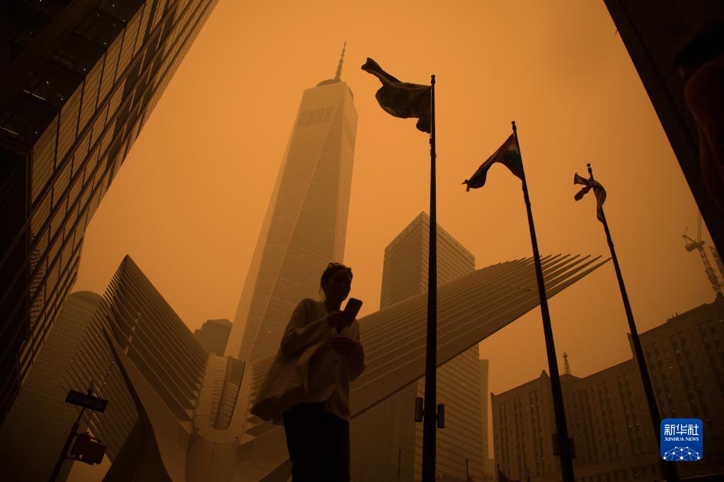 6月7日,一名行人從煙塵籠罩的美國紐約曼哈頓世貿中心附近走過(guò)。