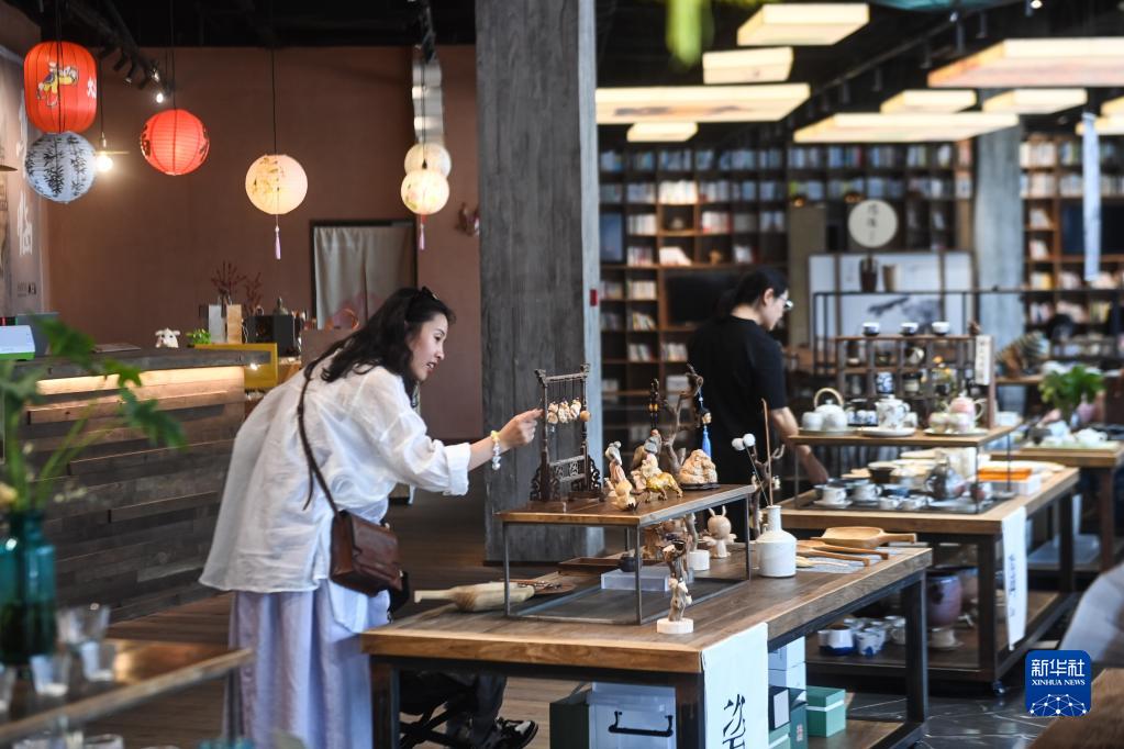 在位于杭州臨安吳越文化公園的“地道吳越”民間手工藝文化空間內,顧客在挑選特色手工藝制品(5月14日攝)。該文化空間集臨安非遺、臨安民藝、文創(chuàng )研學(xué)、休閑體驗為一體,近百件臨安民藝產(chǎn)品在這里匯集。