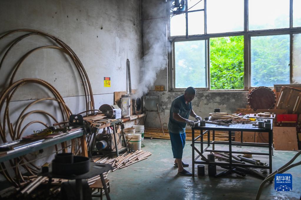 在位于杭州拱墅區的杭州昌盛藤器廠(chǎng)內,工人正在手工加工藤條,通過(guò)熱彎塑形制作傳統藤器(6月7日攝)。這個(gè)廠(chǎng)生產(chǎn)的傳統藤編制品通過(guò)自然造物文化創(chuàng )意團隊在多地的民間手工藝文化空間進(jìn)行展示推廣。