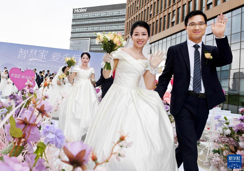 6月10日,新人們在青島市嶗山區海爾科創(chuàng )生態(tài)園新時(shí)代文明實(shí)踐廣場(chǎng)參加集體婚禮。
