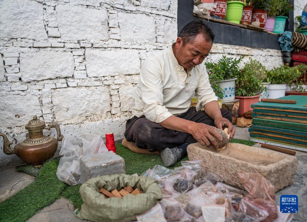 在西藏尼木縣吞巴鎮吞達村,次仁多吉在研磨藥材和香料(6月9日攝)。