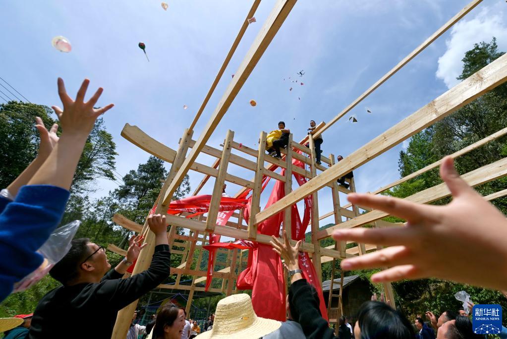 4月26日,在湖北省宣恩縣沙道溝鎮老岔村,村民在舉行吊腳樓落成儀式。