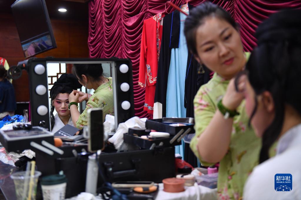 6月5日,在長(cháng)沙市坡子街火宮殿,長(cháng)沙市花鼓戲保護傳承中心的演員在演出前整理頭飾。