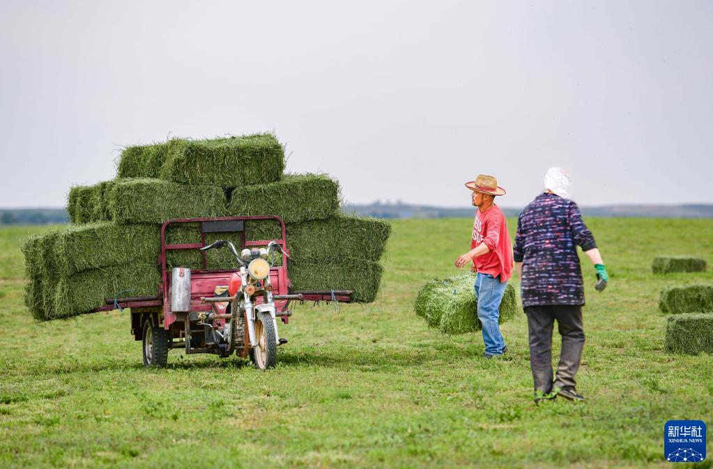 6月10日,鄂托克前旗昂素鎮牧民搬運打捆后的紫花苜蓿。