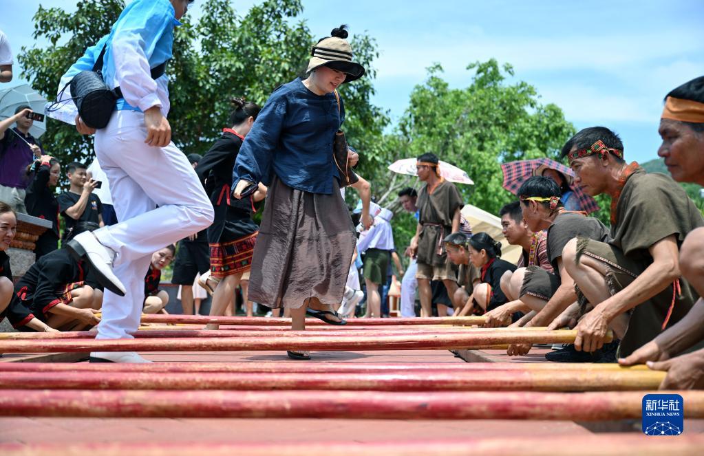 6月10日,2023年“文化和自然遺產(chǎn)日”海南省宣傳展示暨第三屆三亞南山非遺節在三亞市南山文化旅游區舉行,游客在體驗黎族打柴舞。
