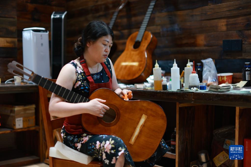 工作人員在正安吉他產(chǎn)業(yè)園內制作吉他(6月7日攝)。