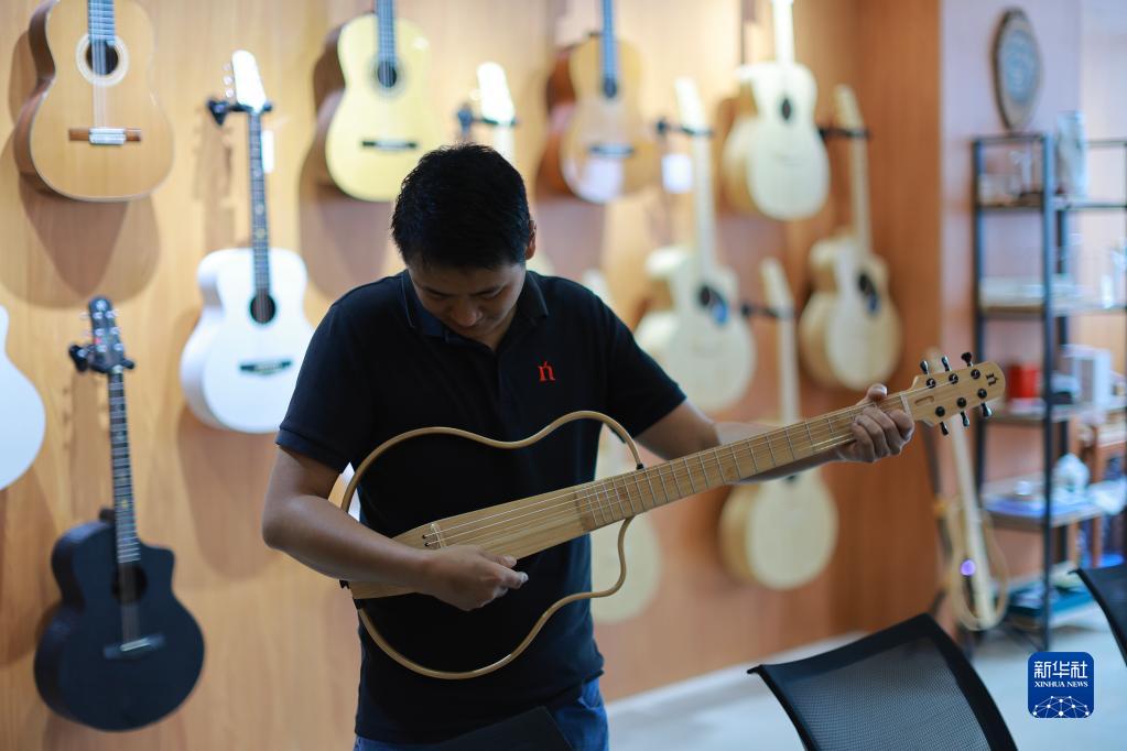 工作人員在正安吉他產(chǎn)業(yè)園內試彈一種新型吉他(6月7日攝)。