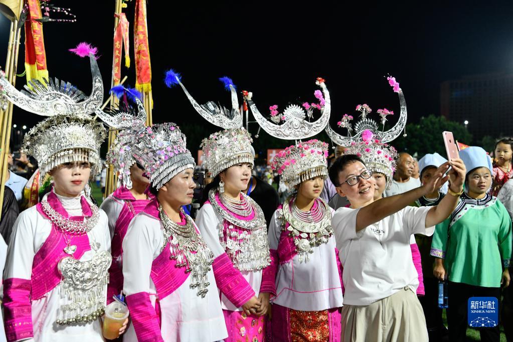 6月9日,一名游客在貴州“村超”足球比賽現場(chǎng)與少數民族拉拉隊合影。