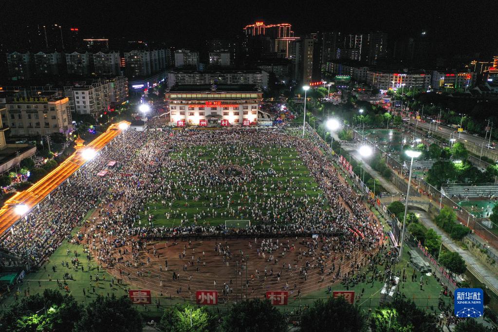 6月10日,演員在貴州“村超”足球比賽后表演民族舞蹈“多耶”,現場(chǎng)觀(guān)眾一起上場(chǎng)狂歡(無(wú)人機照片)。
