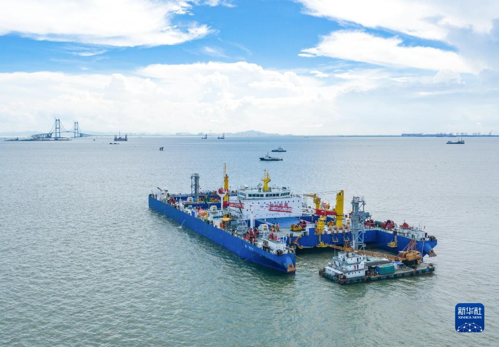 “一航津安1”號沉管運輸安裝一體船在沉放安裝E23管節和最終接頭,背后是建設中的深中通道伶仃洋大橋(6月9日攝,無(wú)人機照片)。