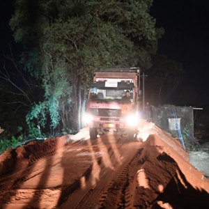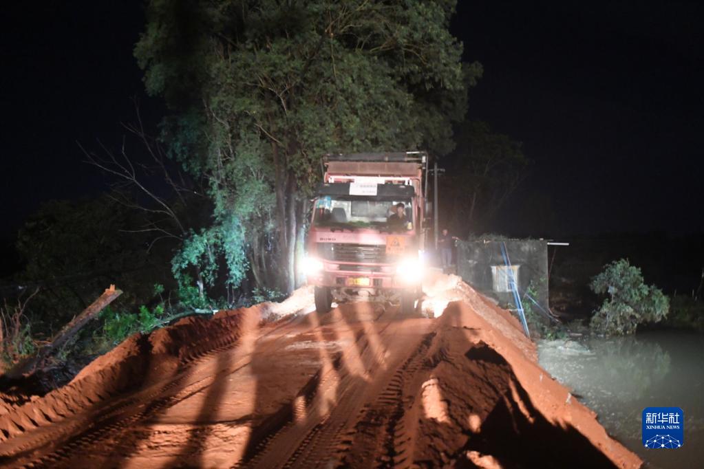 6月11日,在廣西合浦縣白沙鎮,工作人員在連夜施工修復遭受洪水損毀的堤壩。