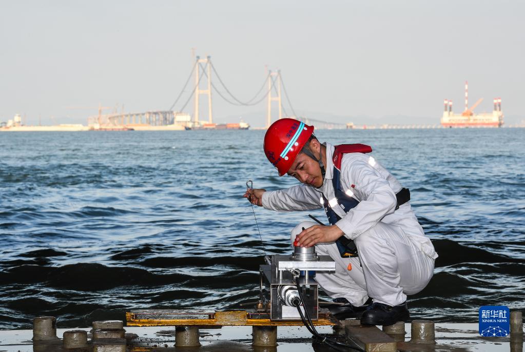 在“一航津安1”號沉管運輸安裝一體船掛載的E19沉管上,鎖旭宏在沉管安裝前最后檢查一遍水下拉線(xiàn)設備工作狀況(2022年7月23日攝)。